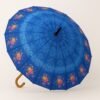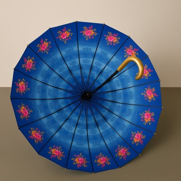 Stay stylishly dry with this vibrant blue floral umbrella! Featuring charming flower accents and a comfortable wooden handle. Try our super 16-rib floral umbrella in brilliant blue offers superior wind resistance and a touch of elegance.