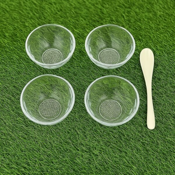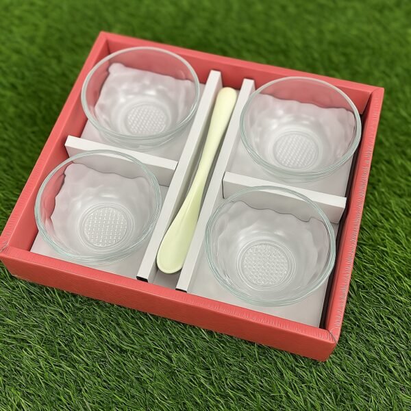 Serve in style with this elegant 5-piece glass bowl set, ideal for desserts, sweets, dry fruits, or snacks. The set includes 4 textured glass bowls and 1 high-quality serving spoon, all neatly packed in a stylish gift box. The bowls have a modern, dotted base design for improved grip and visual appeal, making them suitable for both everyday use and special occasions.